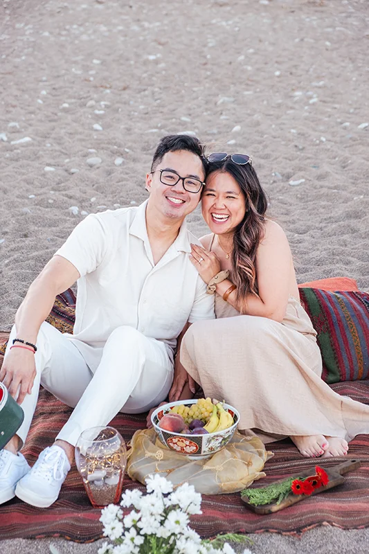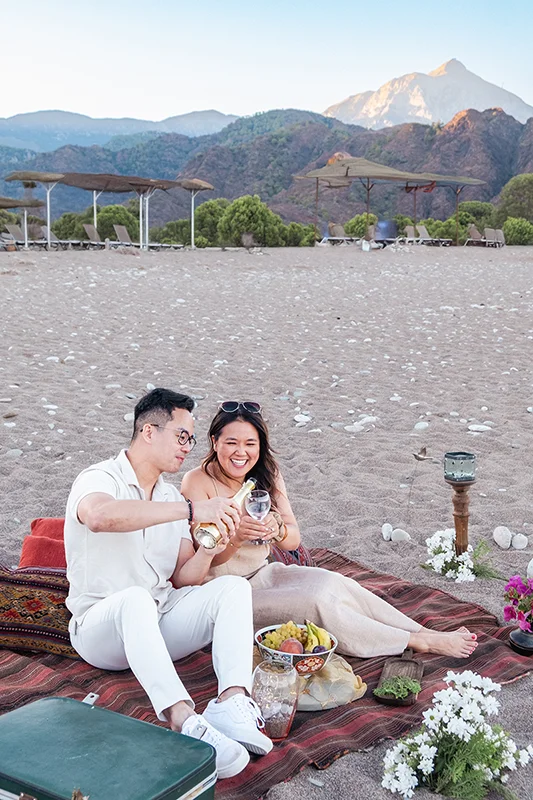 Proposal Photoshoot in Çıralı was a truly magical moment for Calvin and Teresa. During their holiday in Antalya, Calvin surprised Teresa with a romantic beach setup on the stunning shores of Çıralı. Our team carefully designed the scene with candles, champagne, elegant glasses, fresh fruits, cushions, and an authentic Turkish kilim. The soft golden light of sunset turned this unique setup into the perfect backdrop for a life-changing “Yes.”